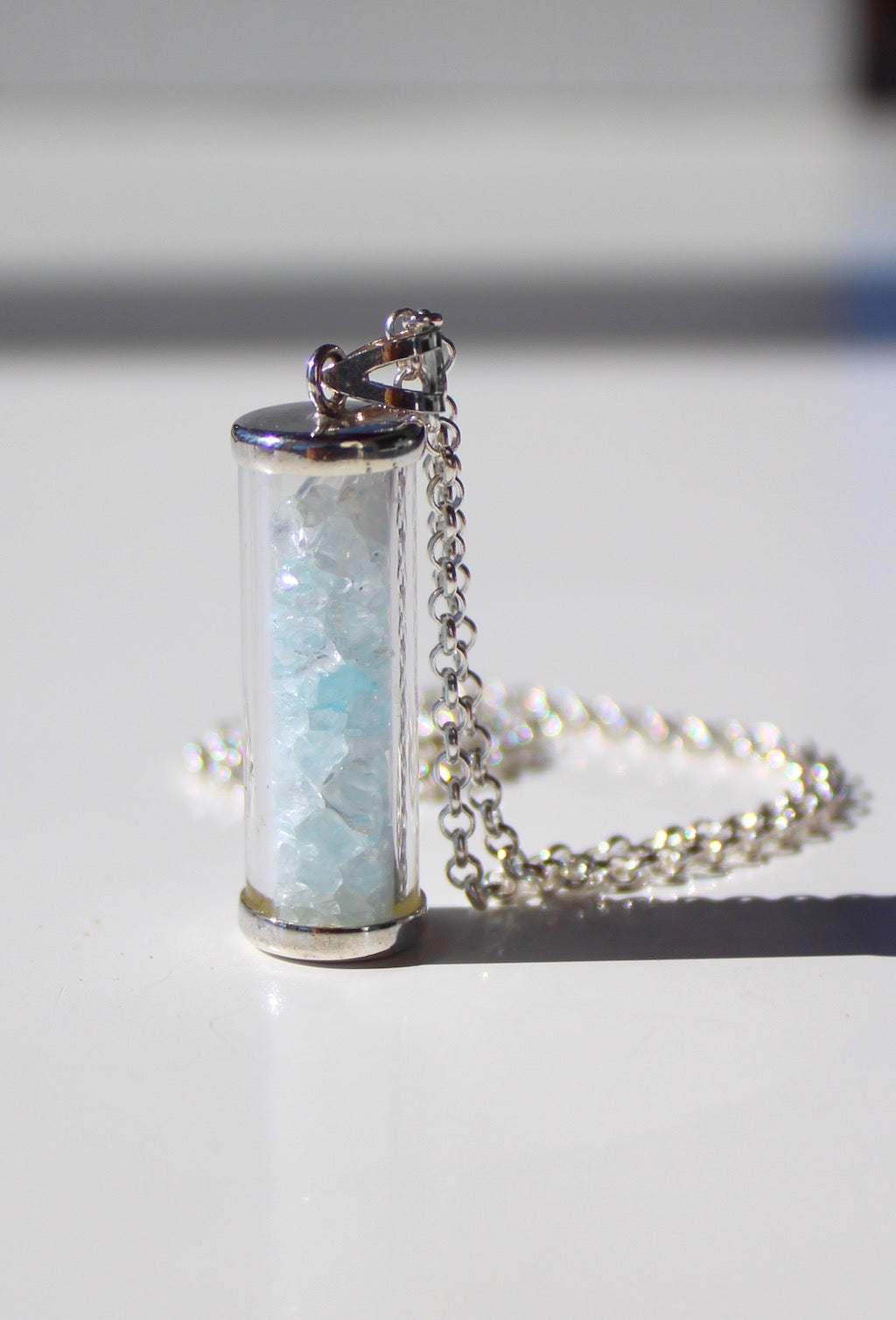 Handmade with natural aquamarine gemstones chips inside a miniature glass and silver pendant.