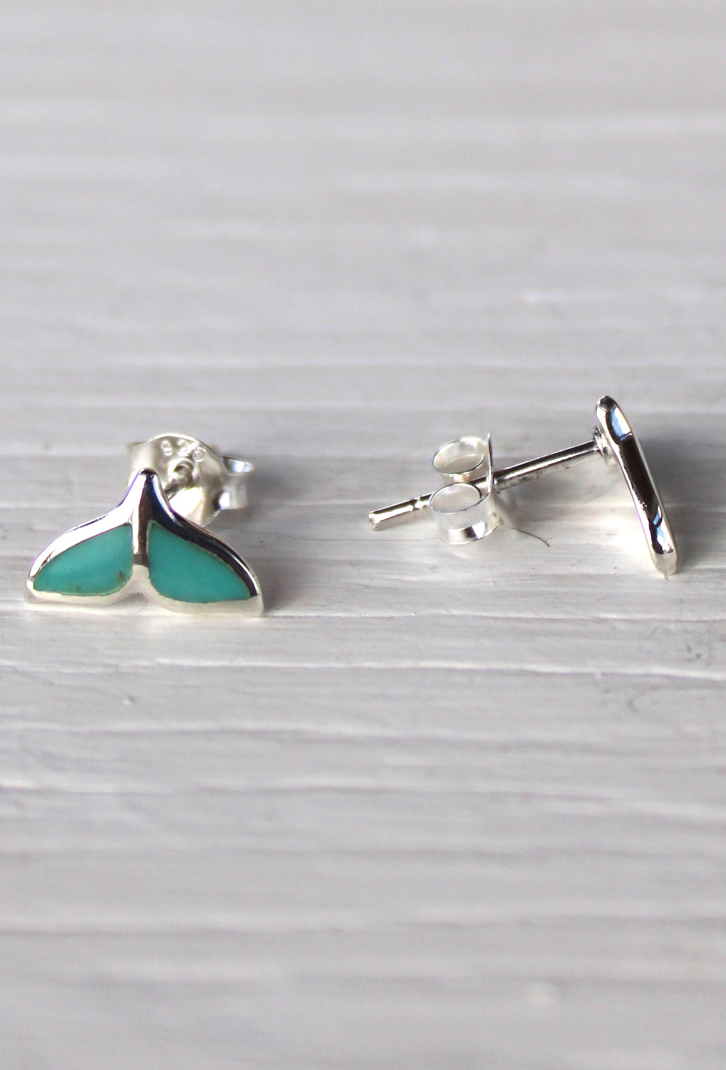 Solid silver whale, dolphin or mermaid tail earrings, with a touch of colour from the natural stone/shell inlay.