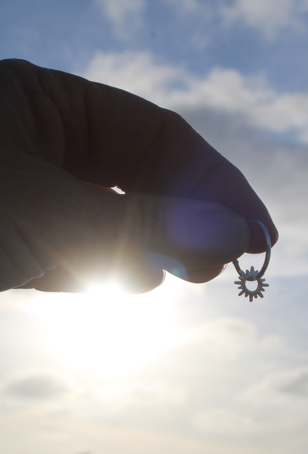 Silver hoop earrings with sunburst, aurora, eclipse charm.