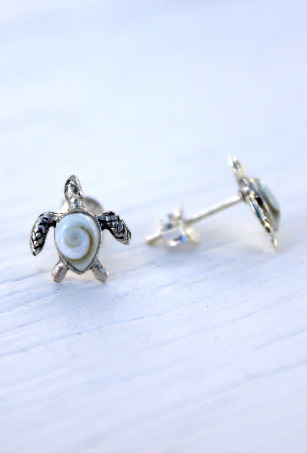 Handcrafted turtle stud earrings combining natural Shiva Eye sea shells and solid silver in a super cute design.