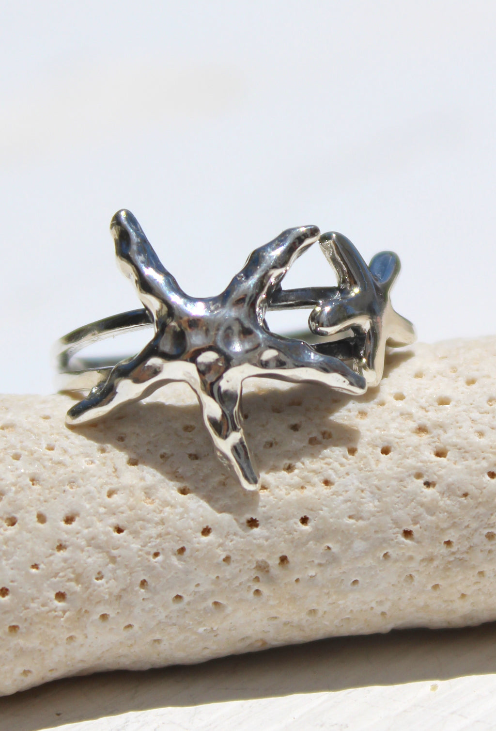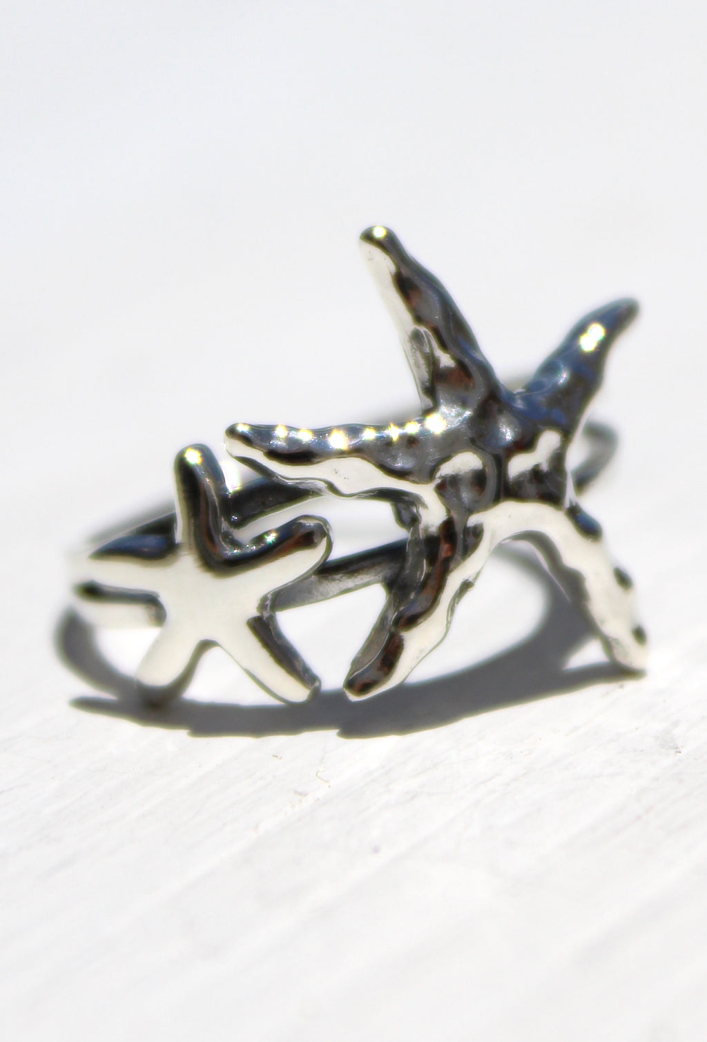 Solid silver starfish ring featuring two starfish, one polished smooth and the other with a hammered texture to catch the light. A perfect ring to wear on holiday, on the beach or as a reminder of the ocean no matter where you are. The starfish are gently curved around the ring making it very comfortable to wear.