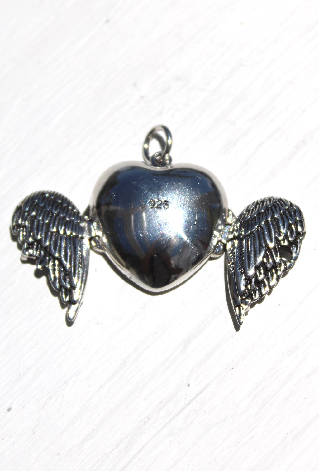Solid 92.5 Sterling Silver winged locket. Beautifully detailed hinged wings fold and lock securely to form the front of the pendant. Perfect to wear a keepsake close to you or simply as a beautiful and different pendant. The back of the pendant has a highly polished smooth finish.